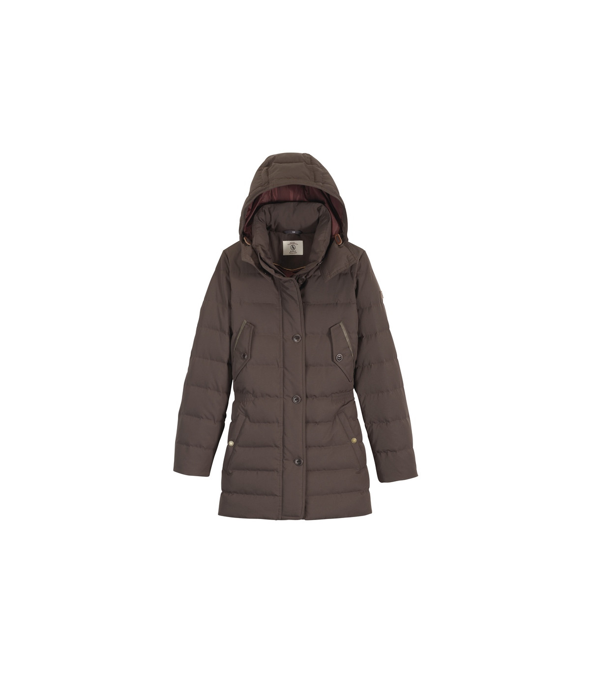 Πολύ ζεστό υδρόφοβο καφέ πουπουλένιο μπουφάν. Ρυθμιζόμενη κουκούλα και ελαστική μέση για καλύτερη εφαρμογή.