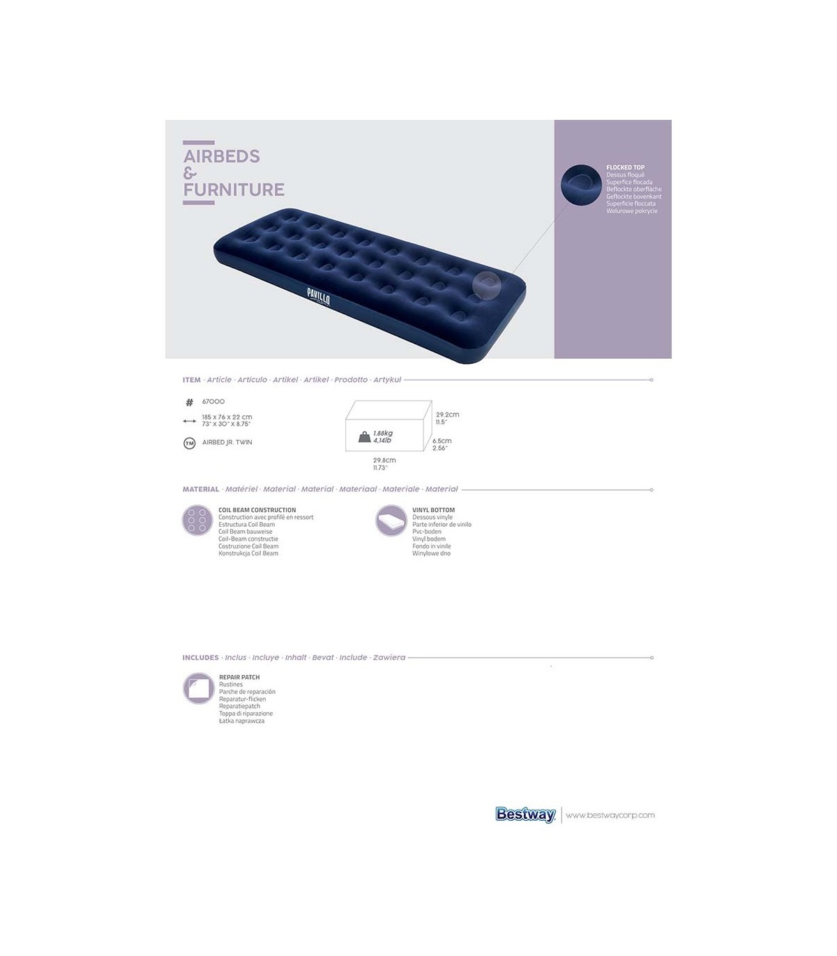 Το Bestway 67000 έχει σχεδιαστεί για να προσφέρει την απαραίτητη υποστήριξη και άνεση χωρίς να καταλαμβάνει χώρο. Η ειδική βελούδινη επιφάνεια PVC λειτουργεί αντιολισθητικά, κρατώντας τα σεντόνια ή τον υπνόσακο στη θέση τους, ενώ ταυτόχρονα προσφέρει μια μαλακή και φιλική αίσθηση στο δέρμα.
